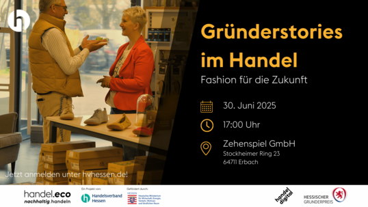 16:00 - 21:00 Uhr Heimathafen , WiesbadenPräsenzDie Gründerstories im Handel sind zurück. Unser Format in Kooperation mit dem Hessischen Gründerpreis bietet Gründerinnen und Gründern eine Bühne und erzählt Erfolgsgeschichten.